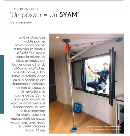 « Système d’ancrage mobile pour les professionnels amenés à travailler en hauteur, le SYAM s’est imposé comme la solution de choix, privilégiée par tous les corps d’état du BTP. En menuiserie, il est une alternative, 100% fiable, à l’échafaudage ou à la nacelle en cas d’impossibilité technique de mise en place ou d’interventions de courte durée… Rencontre avec trois représentants du réseau Répar’stores, avec lequel SYAM collabore depuis 13 ans.